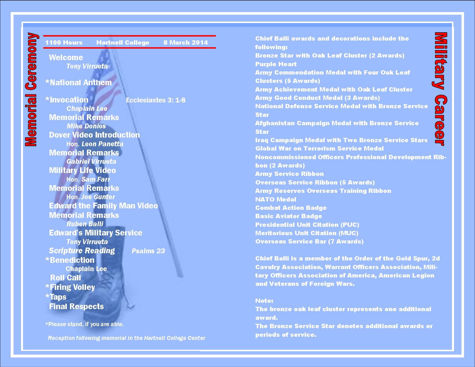 CW2 Edward Balli Military History Chief Warrant Officer Two Edward Balli, 42, of Kapolei, Hawaii, was killed in action at Forward Operating Base Pasab, Afghanistan on January 20, 2014 and assigned to Headquarters and Headquarters Troop 2nd Cavalry Regiment in support of Operation Enduring Freedom. Edward was born and raised in Salinas, California and enlisted into the United States Army Reserves in 1990, Oakland, California. In 1993 he married the love of his life, Kristy and started a new chapter in his military service with her and the children by his side. Edward was stationed at Moffett Field, California in 1995 as a Power Generation Mechanic (52D). During this period he participated in two successful missions in Panama while assigned to Headquarters and Headquarters Company, 353rd Psychological Operations Battalion and Headquarters and Headquarters Company, 12th Psychological Operations Battalion. In 1998 Edward enlisted into the United States Army active component with his first duty assignment to the Regimental Support Squadron 2nd Armored Cavalry, Fort Polk, Louisiana as a Power Generation Repair Supervisor (52D). In 2001 the Army assigned Edward to the 501 st Military Intelligence Battalion, 1st Brigade Combat Team, 1st Armored Division, McCully Barracks, Wackernheim, Germany as a Ground Surveillance System Team Leader (96R). While serving with the 501st Military Intelligence Battalion Edward deployed in support of Operation Iraqi Freedom and Operation Iron Sabre earning the Presidential Unit Citation and Meritorious Unit Citation. From 2005 – 2009 Edward’s next assignment was with the 5th Squadron, 14th Cavalry Regiment, 25th Infantry Division (light), Schofield Barracks, Hawaii as a Unmanned Aerial Operator (96U) then reassigned to the 2nd Squadron 14th Cavalry Regiment as a Tactical Unmanned Aerial Vehicle Operator (35K). While with the 25 th Infantry Division (light) he deployed a second time to Iraq in support of Operation Iraqi Freedom. After completing the Warrant Officer Candidate Course in 2009, Chief Balli was appointed as a Warrant Officer One, Tactical Unmanned Aerial Systems (TUAS) Operations Officer (150U) and assigned to the FIRES Squadron, 2nd Cavalry Regiment, Rose Barracks, Vilseck, Germany. In 2010 Chief Balli deployed in support of Operation Enduring Freedom, Afghanistan. On July 10, 2011, Chief Balli was commissioned as a Chief Warrant Officer Two and was selected as the Platoon Leader for the Unmanned Aerial Surveillance Platoon. Chief Balli and the UAS Platoon successfully completed multiple training events to include the Decisive Action Training Environment in October 2012 and the Mission Readiness Exercise in preparation for the Regiment’s current deployment in 2013 to Afghanistan. Under Chief Balli’s leadership, the UAS Platoon has flown over 6,000 hours in support of ground operations in Regional Command-South. Chief Balli has completed the Warrior Leaders Couse, the Advanced Leaders Course, Warrant Officer Basic Course, Warrant officer Candidate Course, Aviation Warrant Basic Course and the Unmanned Aerial Vehicle Technician Course. Chief Balli served over 48 months in support of the Global War on Terror. His deployments include Iraq (March 2003 – July 2004; December 2007 – February 2009) and Afghanistan (June 2010 – June 2011; June 2013 – January 2014) as a UAS Operator, UAS Technician and UAS Platoon Leader. His fellow Soldiers described Chief Balli as an outstanding leader of Soldiers. He was a person with a kind heart and smile that aimed to please those who he worked for and with. He was a very motivated person who loved his job as an Unmanned Aerial System Operations Officer Platoon Leader, providing the eyes in the sky for those soldiers on the ground. Chief Balli was recognized for his unwavering commitment to his family and country. Bronze Star Medal with Oak Leave Cluster Purple Heart Army Commendation Medal with Four Oak Leave Clusters Army Achievement Medal with Oak Leave Cluster Army Good Conduct Medal (3) National Defense Service Medal with Bronze Service Star Afghanistan Campaign Medal with Bronze Service Star Iraq Campaign Medal with Two Bronze Service Stars Global War on Terrorism Service Medal Noncommissioned Officers Professional Development Ribbon (2) Army Service Ribbon Overseas Service Ribbon (5) Army Reserves Overseas Training Ribbon NATO Medal Combat Action Badge Basic Aviator Badge Presidential Unit Citation Meritorious Unit Citation Overseas Service Bar (7) Chief Balli is a member of the Order of the Gold Spur, 2d Cavalry Association, Warrant Officers Association, Military Officers Association of America, American Legion and Veterans of Foreign Wars. Chief Warrant Officer Two Edward Balli is survived by his wife, Kristy, son, Michael, daughters, Desirae and Momilani, grandchildren, Ikaia and Audrie, mother, Catherine Trevino, brothers, Ruben Balli and Robert Balli, Jr., sisters, Sarah Balli and Ofelia Lopez, numerous aunts, uncles, cousins and preceded in death by his father, Robert Balli, Sr. |